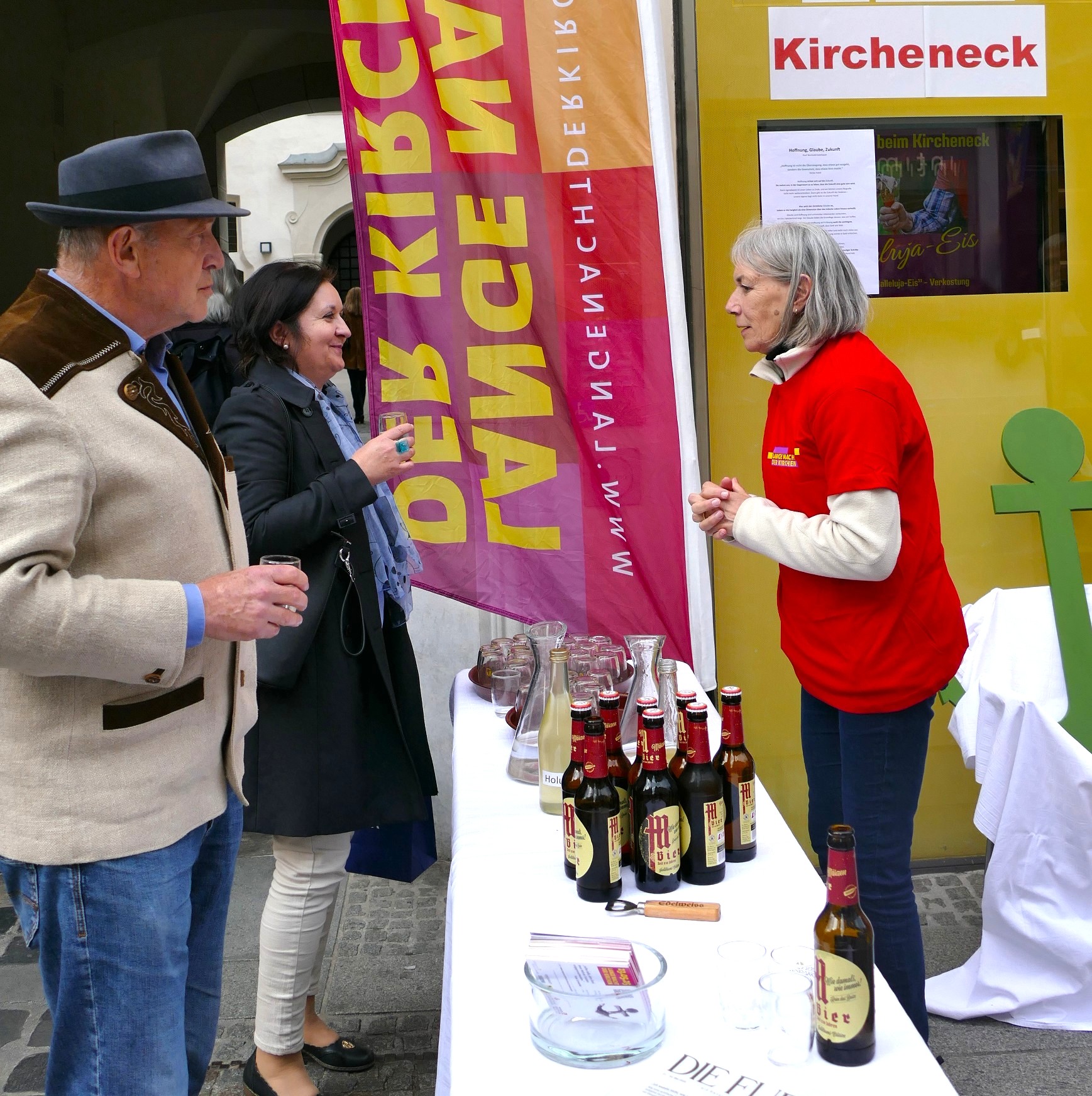 Die AnsprechBAR vor dem Kircheneck bietet kühles Bier, Wasser, selbstgemachten Holundersaft und Personen, die Zeit für Begegnungen und zum Plaudern über Gott und die Welt haben.