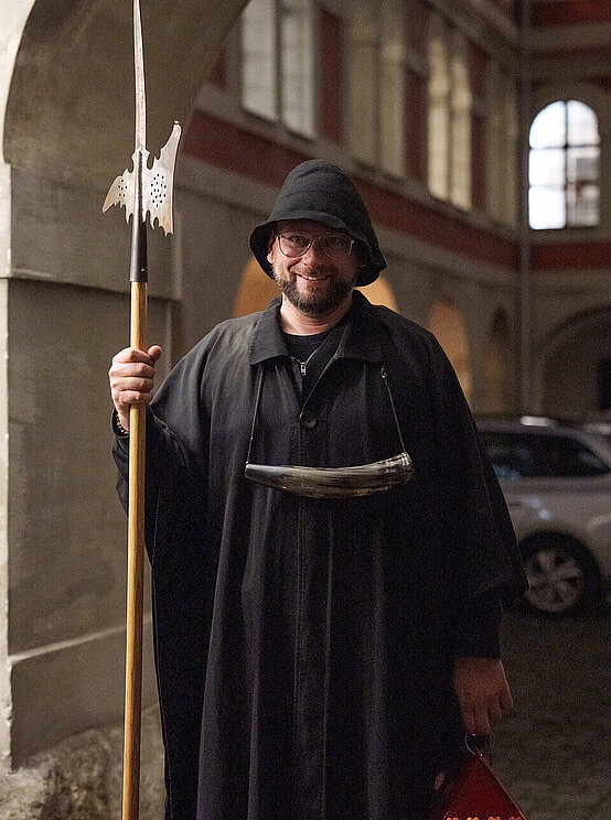 Der Grazer Nachtwächter führt die Teilnehmenden um die Kirche und erzählt gruselige Sagen und Geschichten über das mittelalterliche Leben.
